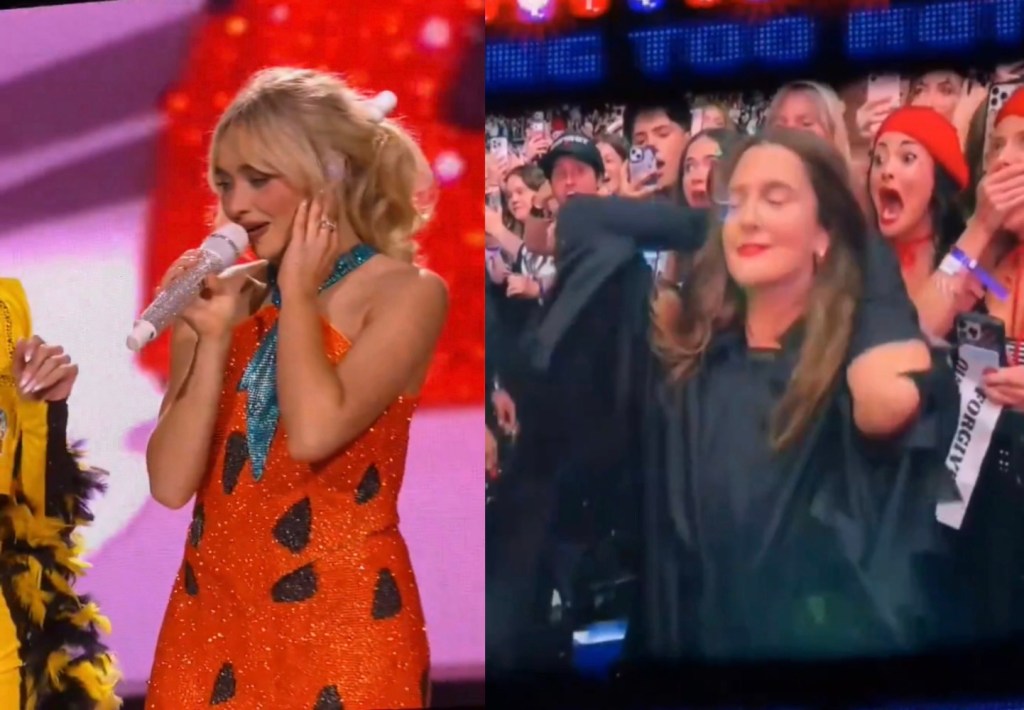 The moment was part of Carpenter’s ongoing tour gag where she humorously “arrests” a celebrity guest near the end of the show. In this case, she handed Barrymore a pair of fluffy pink handcuffs and jokingly accused her of “being too hot,” sending fans into loud cheers and laughter.